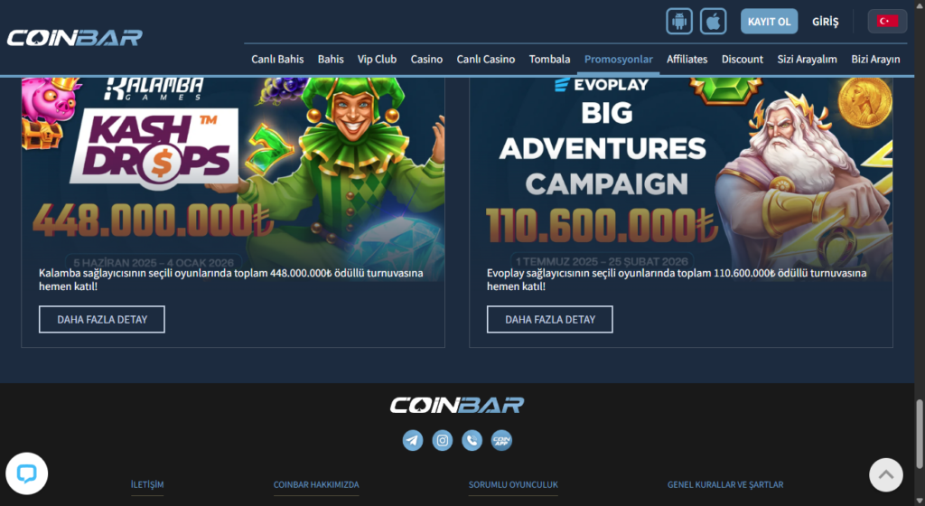 Coinbar, sunduğu çeşitli bonuslar ve turnuvalarla dikkat çekiyor. Kullanıcılar, bu bonuslarla daha fazla kazanma şansına sahip oluyor. Ayrıca, turnuvalar sayesinde heyecan dolu anlar yaşayabiliyorlar. Coinbar, online casino dünyasında kaliteli bir deneyim sunmaya devam ediyor. Bu nedenle, oyun severler için cazip bir tercih olmaya devam ediyor.